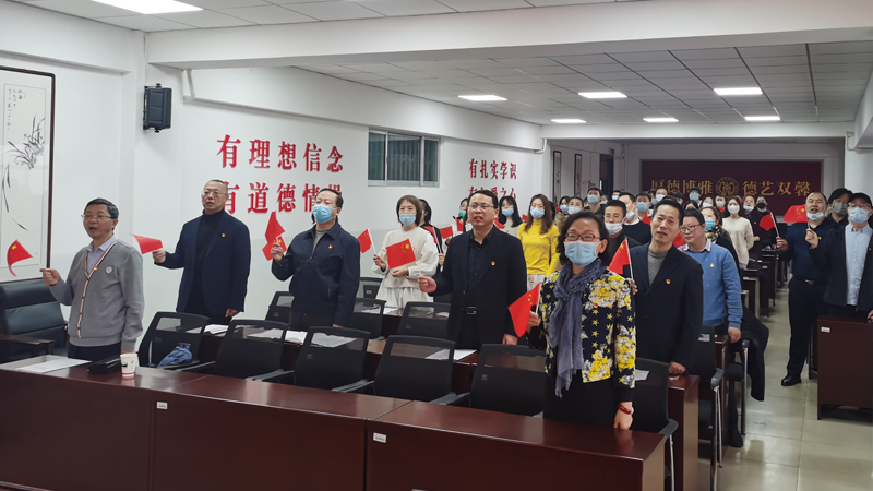 王胜利老师以微党课的形式,从中共一大讲起,提纲契领地向同志们介绍了入党誓词、党旗与党徽的历史来源与演变、不同时期的社会作用等,他讲述的党史人物、党史故事,引起了与会者极大的兴趣。新党员在前排列队第一次佩戴神圣的党徽标识。老党员和新党员一起举起右手,再次重温入党誓词。党员代表、样板党支部书记胡新华做学党史郑重承诺:一定要认真学习党史、不忘初心,知责于心、崇德重礼,刻苦钻研、严谨治学,服务师生、团结协作,廉洁守信、知荣知耻,以实际行动体现党员的先锋模范作用,做到初心如磐、使命在肩。
