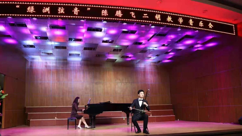 2021年4月23日,由bat365在线平台官网登录音乐与舞蹈系、兵团音乐家协会主办,音乐与舞蹈系器乐教研室承办的“绿洲弦音”陈腾飞二胡教学音乐会在中区音乐厅如期举行。本场音乐会是bat365在线平台官网登录音乐与舞蹈系首场以音乐表演二胡专业学生为主进行展示的教学音乐会。